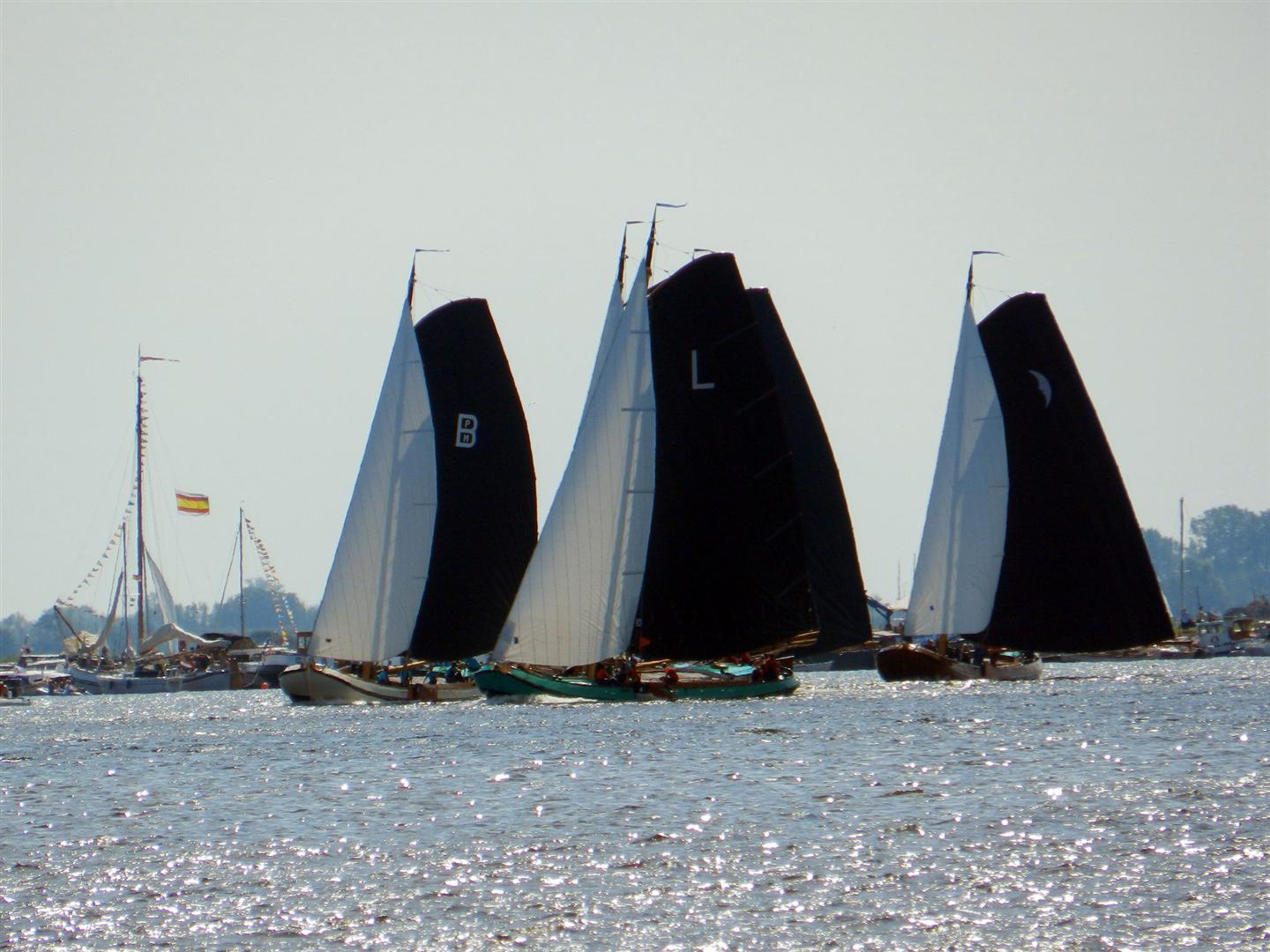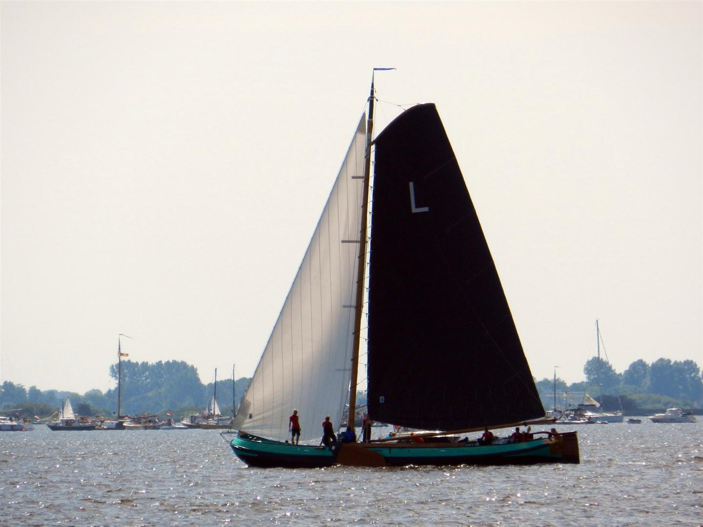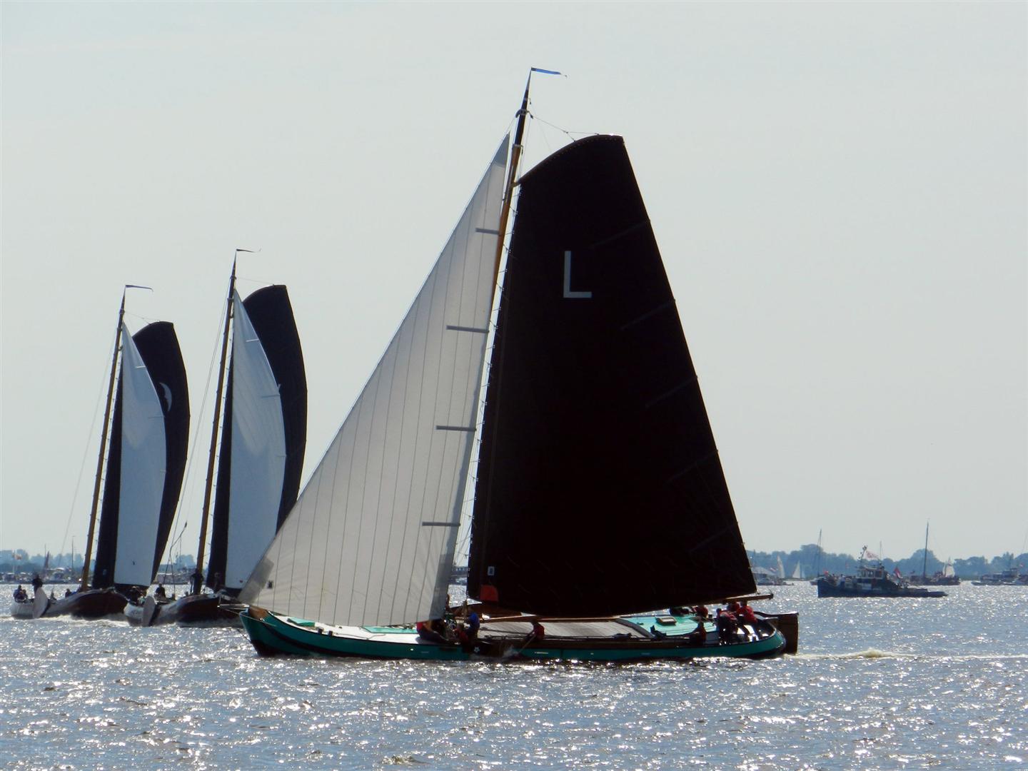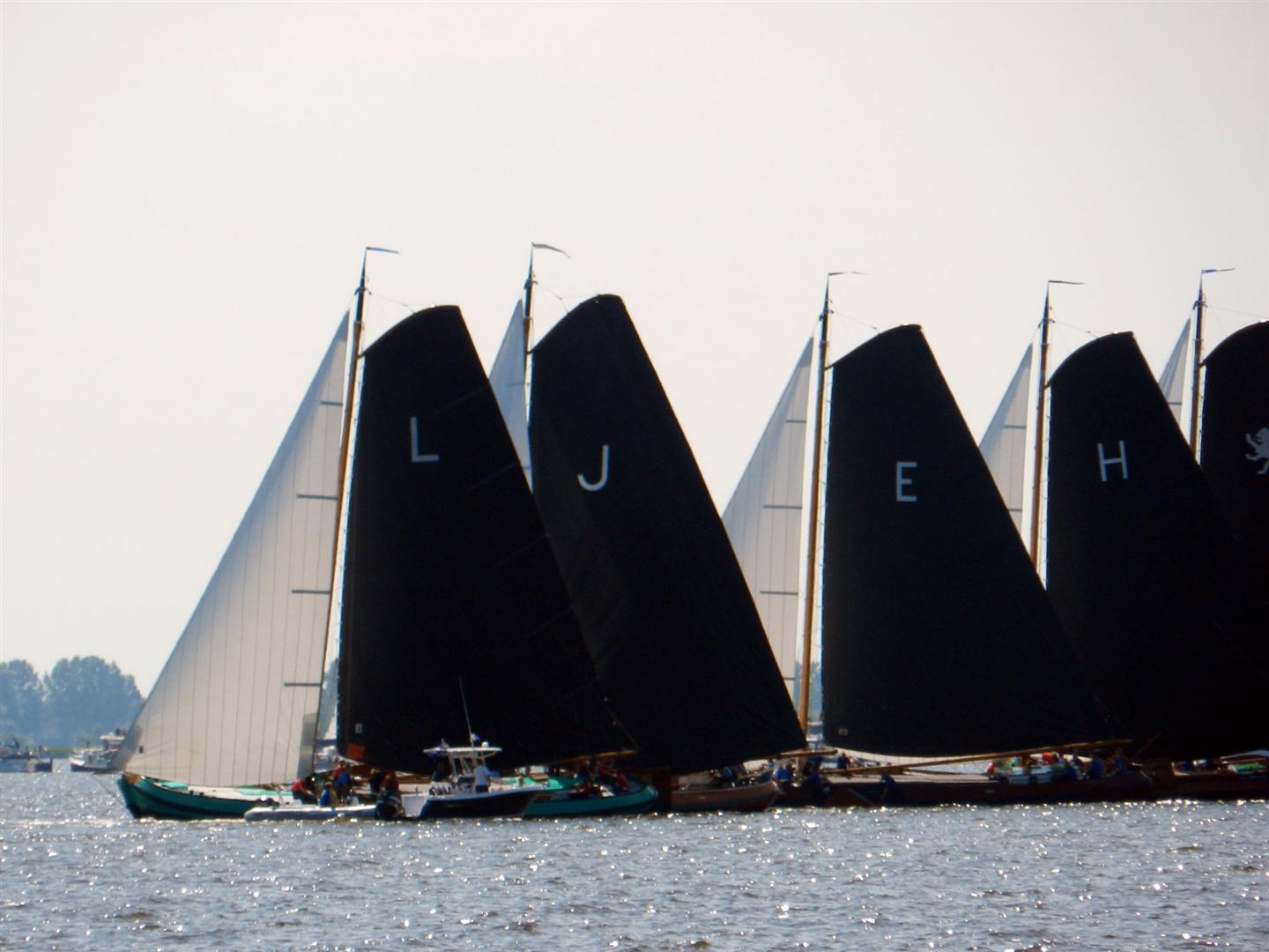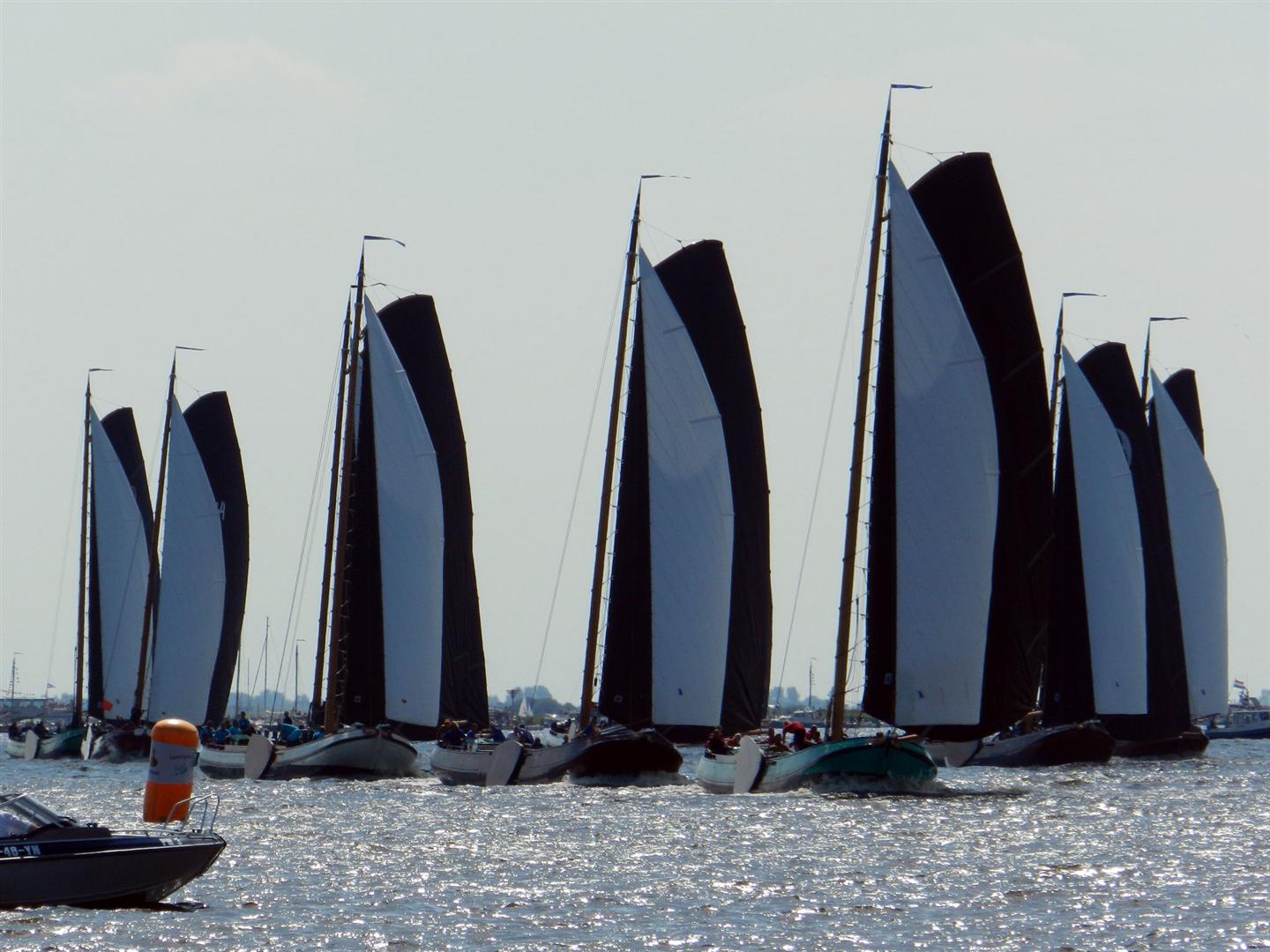 Er lag een mooie route in. En zandloper, dus 2 kruisrakken in 1 route. Precies om 14.00 uur klonk het 10 minutenschot en bij het einde van die minuten lag Johannes, als onderste skûtsje die de lijn naderde. De rest van de vloot lag allemaal wat hoger op de lijn. Wij lagen daar bewust omdat de start niet bovenin lag, maar helemaal onderaan. In de laatste minuut dobber je richting de lijn en je wacht met het aantrekken van de schoten tot het startschot klinkt. Maar in die tijd kwam het skûtsje van de SWH nog aanzeilen. Zij zeilden onder alle schepen langs en stuurden vlak onder ons omhoog. Een schitterende actie van schipper Auke de Groot, want het leek er op dat hij met veel snelheid op de mooiste plaats zou kunnen starten. Hij heeft in die positie ook voorrangsrechten en mag omhoog sturen en ons zo dwingen om ook omhoog te gaan. Hij stuurde ook omhoog en Johannes stuurde ook mee. Boven ons lag Grou die ook weer mee moest. Niets aan de hand zou je denken, maar op het voordek van de SWH was onrust. Zij schreeuwden tegen de schipper dat hij hoger moest. Ik vermoed dat dat was omdat zij anders de startlijn niet konden halen, want er was niet veel ruimte. En de SWH stuurde omhoog en wel zo hoog dat wij niet hoger konden en onze fok zelfs naar stuurboord wel viel, doordat de wind van de andere kant in kwam. De SWH had ons door de wind geduwd. Op dat moment raakten wij elkaar ook nog eens. Maar het gevolg daarvan was wel dat wij stuurboord richting Grou gingen. Ook deze schipper stuurde direct door de wind, wat moest hij anders ook doen? Maar daaronder ging het mis. De skûtsjes zeilden te snel om nog snel genoeg te kunnen reageren en ik zag dat het skûtsje van Sneek met de voorzijde vol tegen de rechterachterzijde van Leeuwarden botste. De wedstrijdcommissie besloot, vanwege de wanorde die er was, tot het afbreken van de wedstrijd. Opnieuw een vorm van veiligheid die alleen maar toegejuicht kan worden.