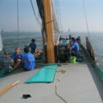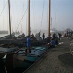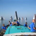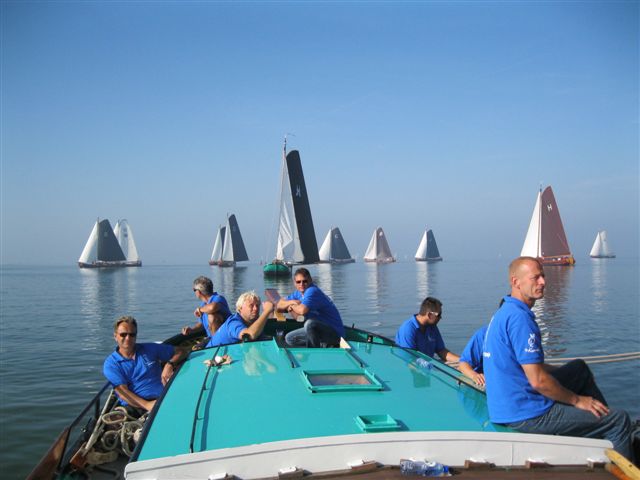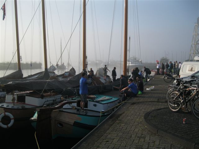 Toen we vanochtend weg moesten hebben we eerst gewacht op voldoende zicht, want er hing mist. En die mist was zo dicht dat we op het IJsselmeer niets te zoeken hadden. Maar uiteindelijk trok de mist op en konden wij samen met het skûtsje van Langweer, die nog een motor had, richting de start. De start was weer uitgelegd buiten de 4km. De route kwam overeen met die van gisteren. Dus eerst tegen de wind in het IJsselmeer op, dan voor de wind naar Lemmer en dan in de baai nog een klein kruisrak, waarna we het IJsselmeer weer op moesten.