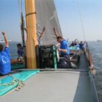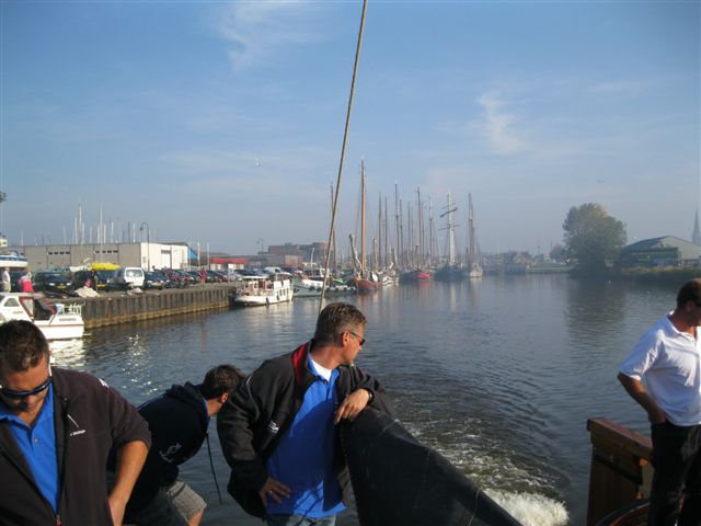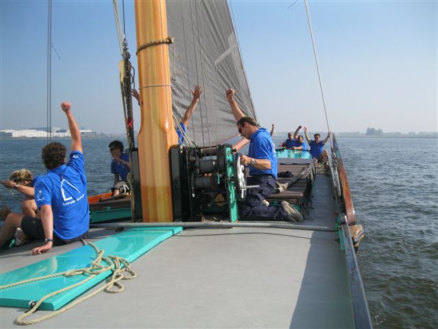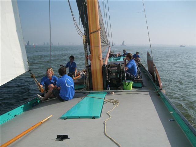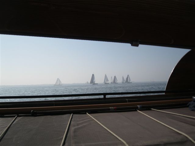 Bij het inzeilen hadden we gezien dat de mooiste startpositie niet lag bij het startschip, maar meer naar onderen toe. Daar waren wij dan ook te vinden. Het grote voordeel was meteen dat wij niet, zoals gisteren, tussen veel ander schepen lagen,want op de en of andere manier willen veel schepen toch altijd starten bij het startschip. Wij hadden dus vrije wind. Onder ons lag d’Halve Maen en boven ons lag de Sneker Pan. Zo gingen we de startlijn over. Allemaal over bakboord en zorgen dat we zo snel mogelijk bij de hoogste ton kwamen. Sneek lag nog een tijdje op een positie dat wij niet door de wind konden, maar toen Sneek over stuurboord richting de hoogste ton ging, draaide Johannes meteen mee. Wij liepen daarna ook sneller dan Sneek en uiteindelijk lagen we zo gunstig dat Sneek op ons moest wachten voordat ze naar de hoogste ton toe konden draaien. En de rest van het veld? Die waren nog ver verwijderd van ons. Wij konden toen al wel concluderen dat wij de beste start hadden en met Sneek zouden gaan strijden om de 1e plaats.