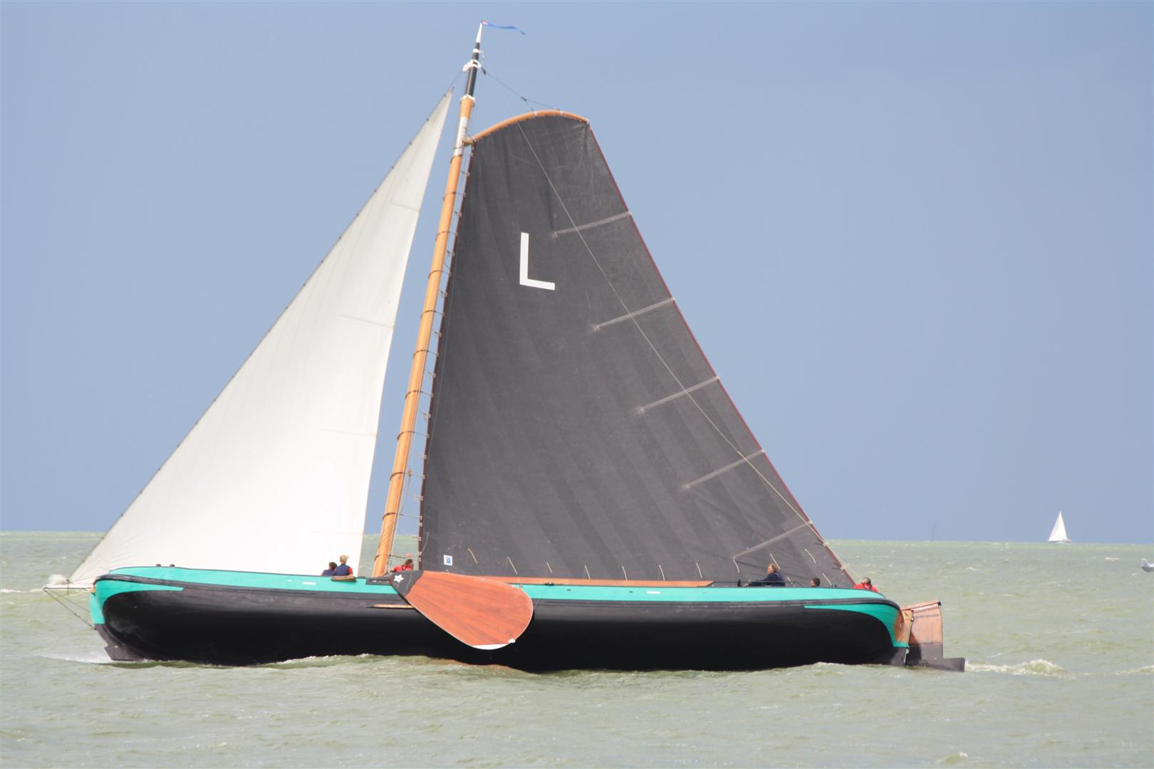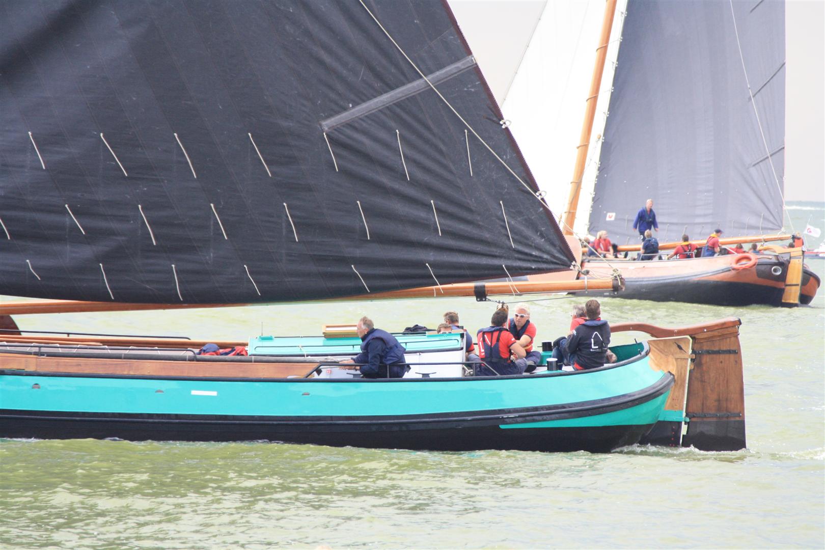 Maar de wedstrijd ging door en opnieuw niet in ons voordeel. Toen wij route 2 ingingen naar de hoogste ton, bleek dat de skûtsjes die achter ons aan kwamen de wind veel beter troffen. Zij lagen misschien maar 100 meter achter ons, maar toch konden zij veel hoogte en ook snelheid zeilen, terwijl was geen hoogte en ook geen snelheid hadden. Opnieuw verloren wij een positie. Eerlijk gezegd weet ik niet precies op welke positie wij lagen toen wij de hoogste ton weer ronden, maar er lagen veel voor ons. Maar een groepje van 3, dat voor ons om de ton heen ging, raakte in elkaar verstrikt. Ik zag dat Langweer en Leeuwarden elkaar raakten en even aan elkaar vast zaten. Nu zat het ons even mee, want konden meteen boven hen steken en zo 3 plaatsen vooruit komen. Ik denk dat we hierna op de 6e plaats kwamen, ook onze uiteindelijk finishpositie. Deze finish werd er vroeg ingelegd vanwege naderend onweer, terecht natuurlijk, maar bij die finish lagen wij alweer vlakbij Drachten en Bolsward. Met een nog een route en een constante wind hadden wij goede kans gemaakt deze 2 weer in te halen, want op dit IJsselmeer liepen wij sneller. Maar de windschiftingen hebben het ons niet mogelijk gemaakt beter naar voren te komen. Dus 6e over de streep, met 3 extra punten vanwege de groene vlag.