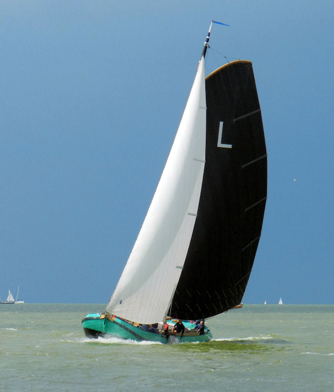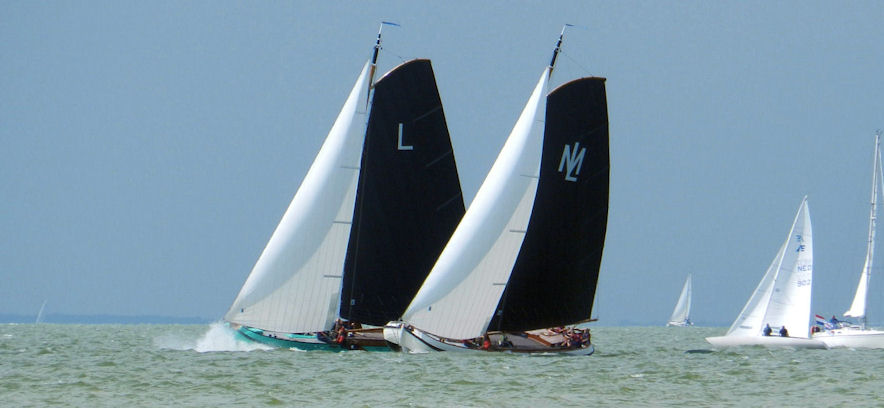 En nabij 14.00 uur was dat ook zo, want er stond beduidend minder wind en zou je nog eerder gaan denken aan een lichtweerfok, dan aan een zwaarweerfok. Maar de start klonk en wij kwamen, redelijk onderaan de startlijn mooi vrij weg. Mooi het kruisrak door, maar toen kwam, terwijl wij op stuurboord lagen, het skûtsje van Woudsend er aan. Wij moesten dus voorrang verlenen en het leek er in het geheel niet op dat wij er voor langs konden. Maar, op het moment dat we mee begonnen te draaien met Woudsend, veranderde de wind iets en toen bleek dat het wel kon. Maar het skûtsje had de kop net omgezet en wij moesten wel een kleine slag omhoog maken. Dus na 200 meter al weer door de wind richting de hoogste ton. En, hoe bestond het, daar kwam Grou aan, in een zelfde positie als Woudsend eerder, maar nu leek het dat wij er net voor langs konden. En dus zeilden wij door. Maar, ik moet eerlijk zeggen, het was wel heel extreem, en als de schipper van Grou had gewilde, had hij ons wel aan kunnen roepen, Maar hij had er nagenoeg geen last van en, zoals toch wel gebruikelijk binnen de SKS, dan wordt er niet gezeurd, maar doorgezeild.